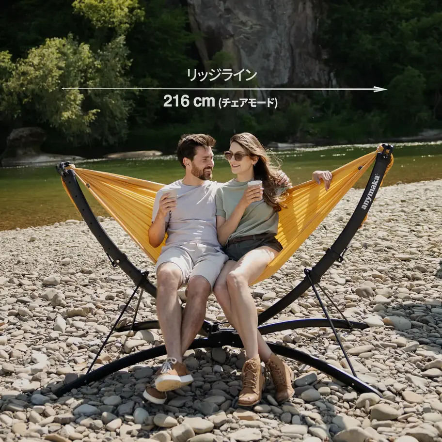 木が無くてもどこでも好きな場所に設置できる自由さと、どこでも快適に過ごせるanymaka ウルトラライト ダブル ハンモックををご体験ください。