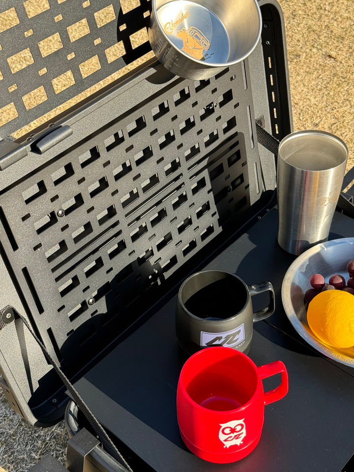 mindボックスに、加工なしで取り付け可能なパネルです。小物ギアを自由に取り付けることが出来たり、モップハンガーやピカニティレールが取り付けれるデザインになってます。